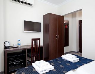 Шестиэтажное здание отеля, выстроенное в современных формах, возвышается недалеко от набережной реки Мзымта на улице Интернациональная. Жилой фонд предлагает отдыхающим комфортабельные номера, в каждом из которых имеется индивидуальный санузел, в комнатах установлена сплит-сплит система, есть необходимая техника: телевизор, электрочайник, мини-холодильник, фен.