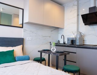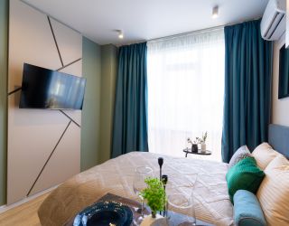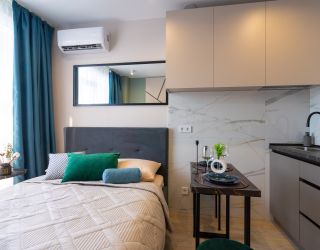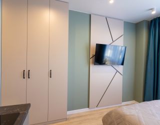 В апартаментах есть все необходимое для комфортного проживания. Каждый укомплектован удобной мебелью, собственным санузлом с душем, имеется высокоскоростной интернет Wi-Fi, телевизор с цифровым ТВ и более 100 каналов, холодильник, микроволновая печь, плита электрическая, электрический чайник, стиральная машина, гладильная доска, утюг, сушилка для одежды, а также постельное белье, полотенца, ванные принадлежности, кофе, чай, фен.