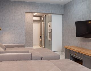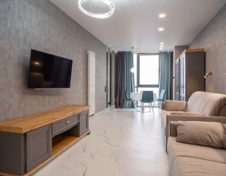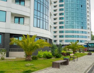 Апартаменты «Симфония» расположены в семи 21-этажных домах Адлерского района города Сочи. Парковая территория комплекса занимает 5,5 га. Для любителей солнечных ванн и отдыха вблизи спроектированы зоны для загара у открытого бассейна, оборудованные всем необходимым: шезлонгами, зонтиками, баром с прохладительными напитками. Для любителей провести время с пользой для здоровья комплекс предлагает оборудованный спортивный зал, футбольное поле, площадки для баскетбола и волейбола, настольный теннис, уличные тренажеры. Для детей спроектирована детская площадка в виде корабля с фонтаном. В жилом комплексе работает продуктовый супермаркет. Апартаменты оборудованы всем необходимым для комфортного проживания: удобной мебелью, ванной комнатой с душевой кабиной, мини-кухней и бытовой техникой. Апартаменты оснащены: двумя раскладными диванами, столом, стульями, тумбой, шкафом, вешалкой, телевизором, холодильником, кондиционером, электрической плитой, духовым шкафом, посудомоечной машиной, микроволновой печью, электрическим чайником, набором посуды, стиральной машиной, феном, туалетно-косметическими принадлежностями.