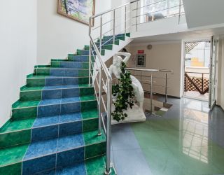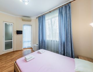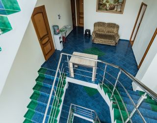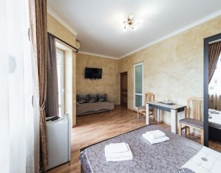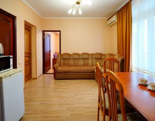 Пятиэтажный корпус отеля возвышается на закрытой охраняемой территории. Жилой фонд, способный единовременно принять более 50 человек, предлагает гостям номера разной категории комфорта — от скромных Экономов до роскошных Люксов с собственной сауной. В каждом номере независимо от категории имеется индивидуальная ванная комната, беспроводной интернет, кондиционер и телевизор. В некоторых комнатах предусмотрены балконы, с которых открываются виды на море.