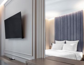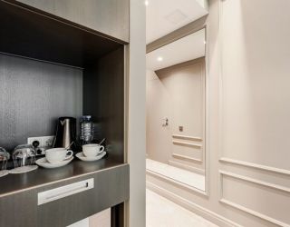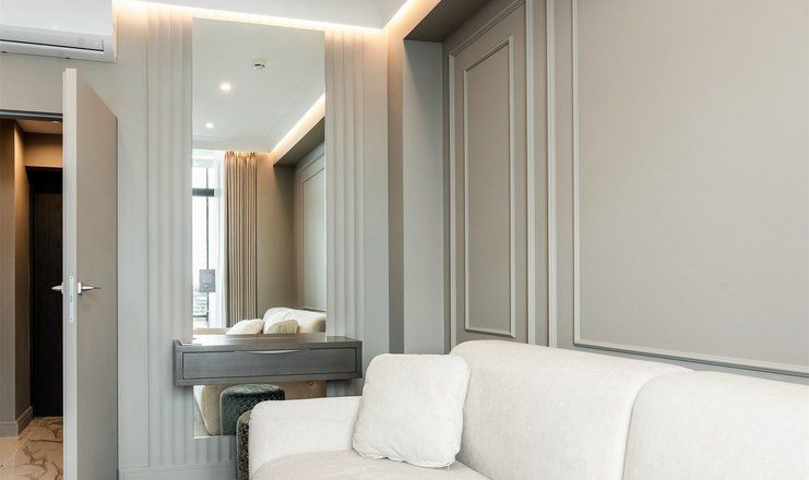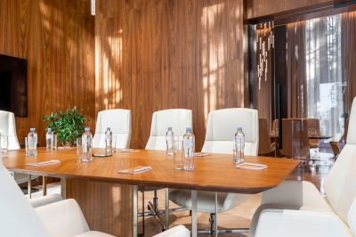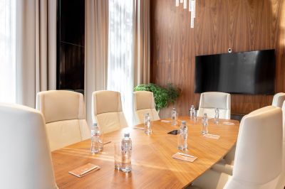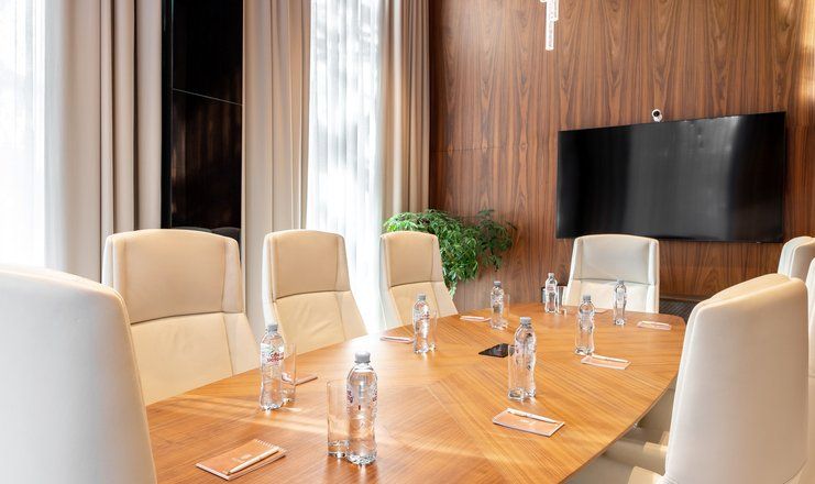 Комната оборудована широкоформатным дисплеем, большим рабочим столом, 8 полноценными рабочими местами. Из окон открывается вид на внутренний двор с парковой зоной.