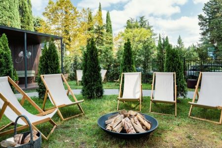 Поездом до ж/д вокзала Адлер, далее на автобусе №551 до остановки «Санаторий Изумруд», далее 880 м до отеля.