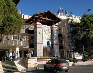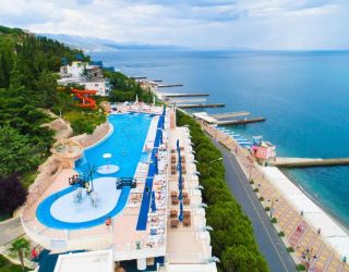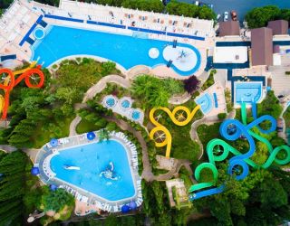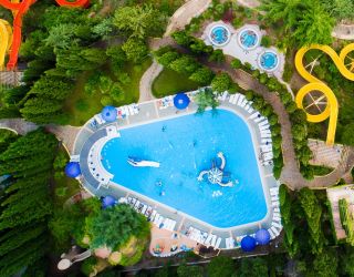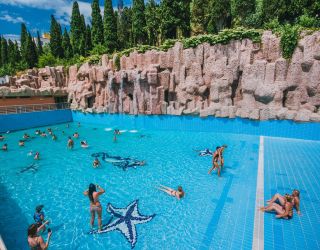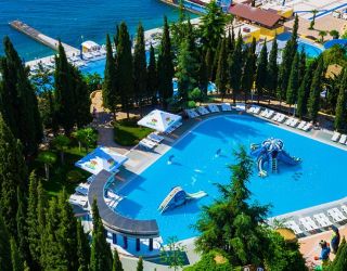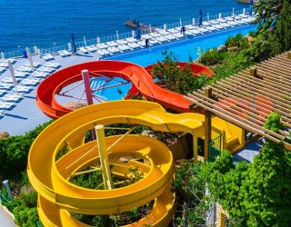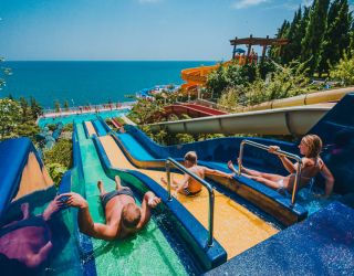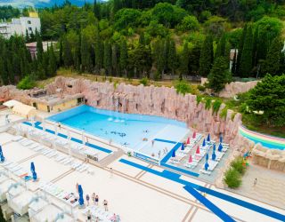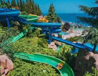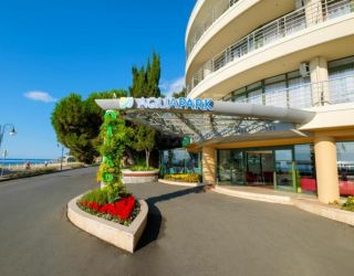 Отель «Аквапарк» в Алуште расположен в Профессорском уголке города, на первой береговой линии. Он входит в курортно- рекреационный комплекс «Миндальная роща» вместе с аквапарком, который дал имя всему объединению, комплексом вилл «Жасмин» и отелем «Морской». Все развлекательные объекты курортной зоны города находятся по соседству с отелем.
