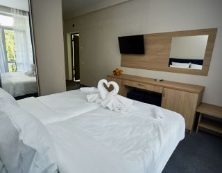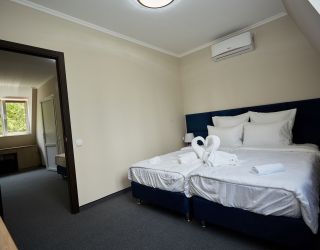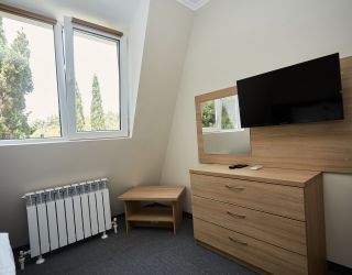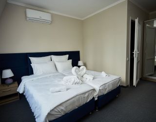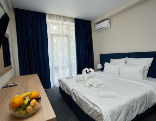 Четырехэтажный корпус отеля с мансардным этажом занимает небольшую благоустроенную территорию в 300 метрах от моря. Жилой фонд, способный единовременно разместить до 46 человек, предлагает гостям однокомнатные и двухкомнатные номера Люкс. В номерах стильный лаконичный интерьер, есть индивидуальный санузел с душем, кондиционер, плазменный телевизор, фен, электрочайник.