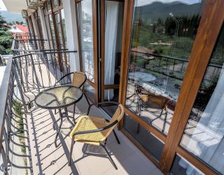 Поездом до ж/д вокзала г. Симферополь, далее на автобусе «Симферополь – Ялта» до остановки «Автовокзал Алушта», далее пешком 480 м до отеля.