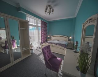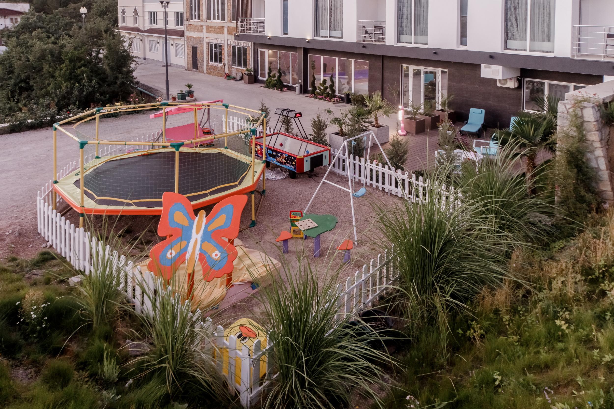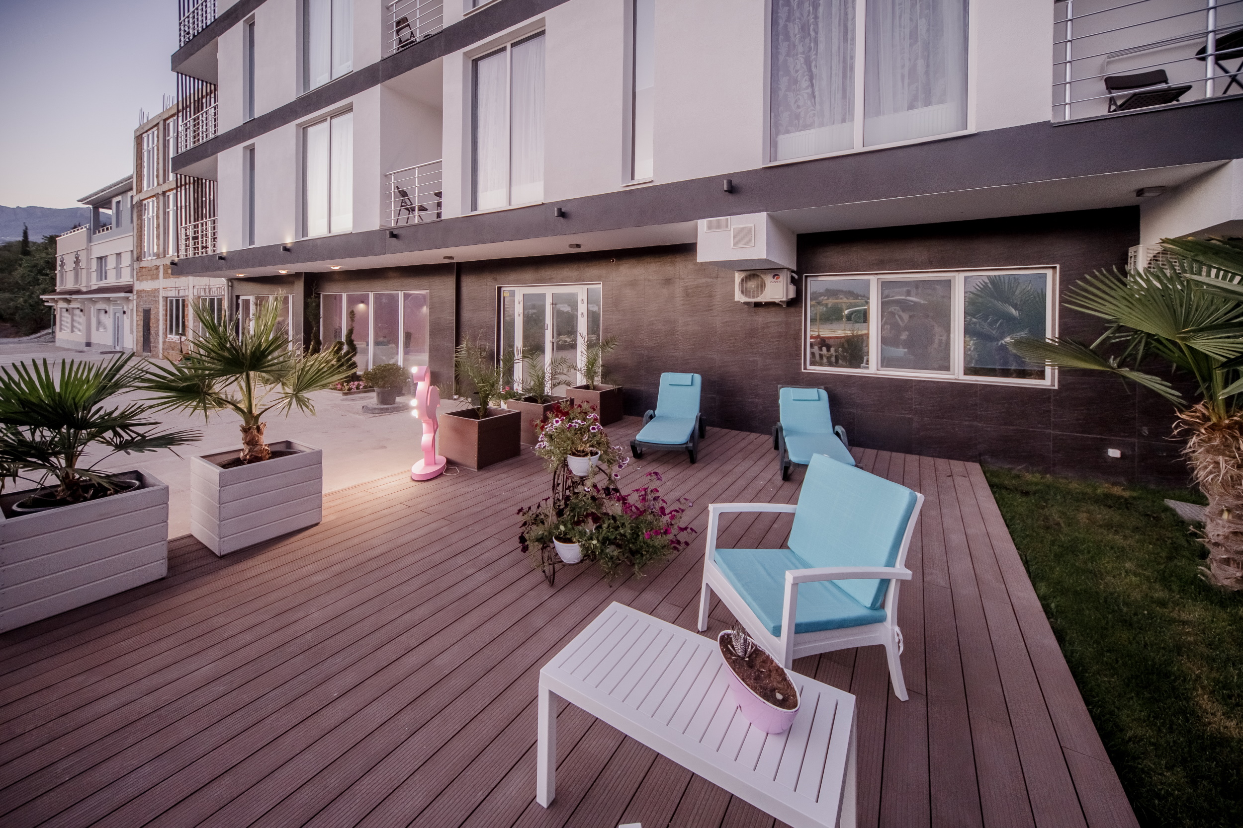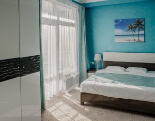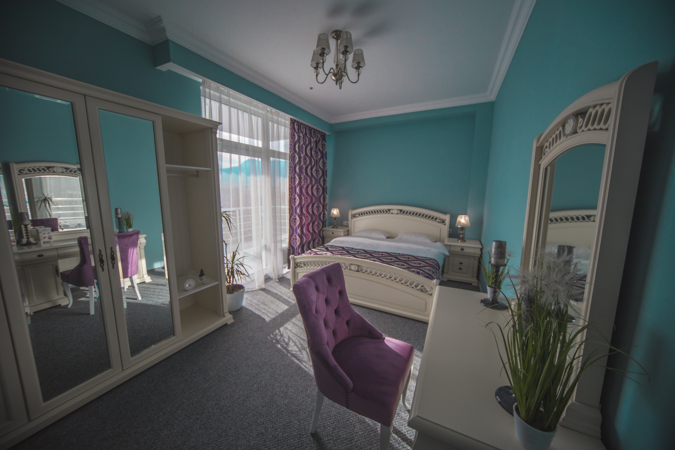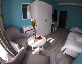 Семиэтажное здание отеля, оснащенное лифтом, возвышается на благоустроенной территории с современным стильным дизайном. Жилой фонд предлагает отдыхающим однокомнатные номера Стандарт и Полулюкс и двухкомнатные Люксы. В каждой категории номеров свой оригинальный интерьер в светло цветовой гамме с использованием ярких синих или бирюзовых оттенков. Все комнаты оснащены душем, кондиционером, необходимой бытовой техникой, имеются меблированные балконы с видами на море или горы.