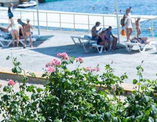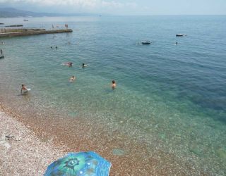 Пляж из крупной розовой гальки. Расположен напротив отеля в 25 метрах от корпуса, оборудован теневой зоной, шезлонгами и раздевалками. На пляже работают спасатели.
