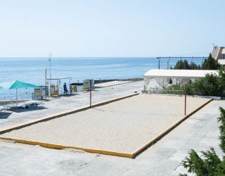 Пляж галечный, благоустроенный, оборудован раздевалками расположен в 25 м от корпуса. Верхний ярус оборудован теневой зоной, шезлонгами и раздевалками, здесь также находится волейбольная площадка. На пляже работают спасатели.