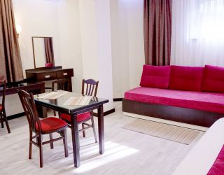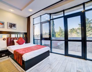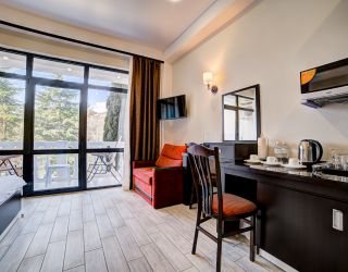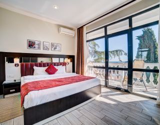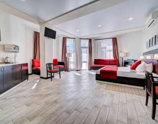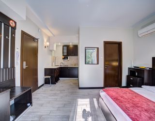 В 6-этажном здании современной архитектуры есть лифт и все удобства для проживания гостей. Отдыхающие размещаются в 16 комфортабельных номерах с лоджиями. Просторные апартаменты, компактные студии и универсальные номера категории стандарт порадуют гостей красивыми видами. В номерах есть интернет и ЖК телевизор, кондиционер и теплый пол (в зимний период), мини-кухня и мини-холодильник, набор посуды и электрочайник, сейф и электронный замок. В распоряжении гостей – сауна, хамам и джакузи.