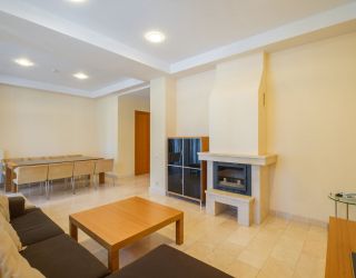 - гостиную с камином, оборудованную кухню с посудой, кухонными приборами и принадлежностями