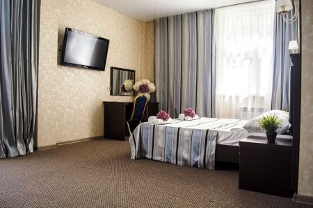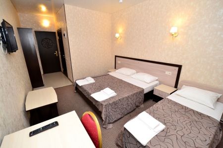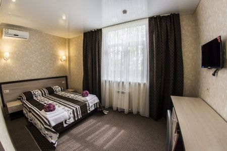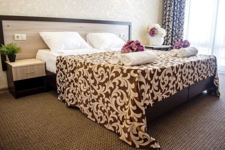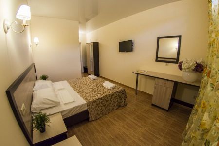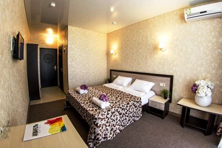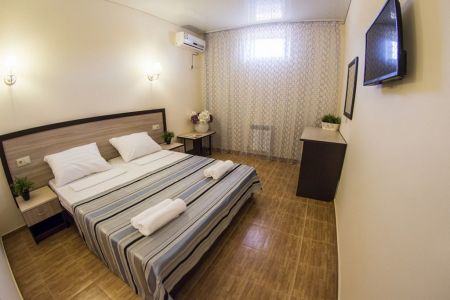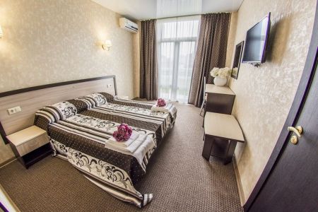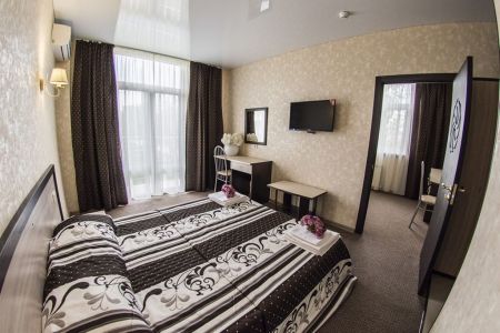 Поездом до ж/д вокзала г. Анапы, далее на маршрутном такси №120 до остановки «Паралия», далее пройти пешком 410 м до отеля.