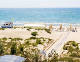 - пользование собственным оборудованным пляжем (шезлонги, навесы, кабинки, туалет, спасательный и мед пост)