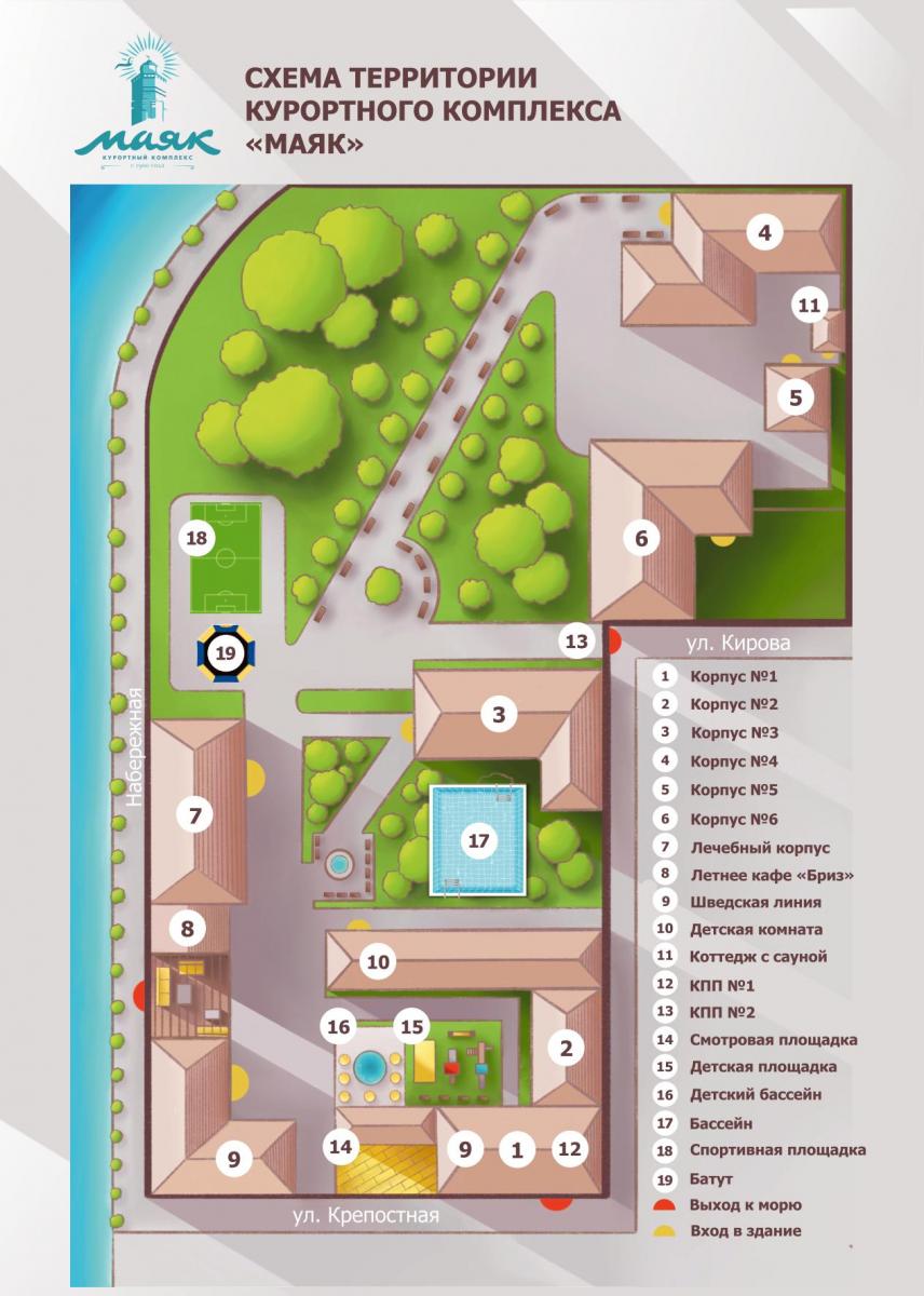 Ярко оформленные номера Курортного комплекса "Маяк" оборудованы кондиционером, телевизором со спутниковыми каналами и мини-баром. В ванной комнате в номере предоставляются туалетно-косметические принадлежности и фен. Из окон некоторых номеров открываются живописные виды на Черное море.
