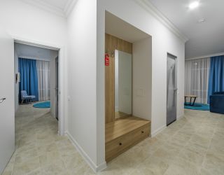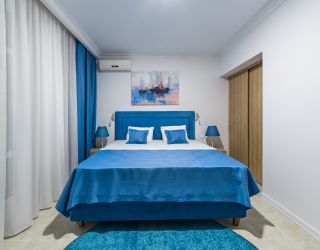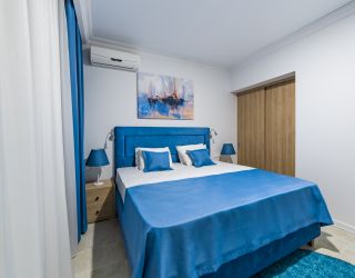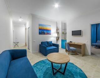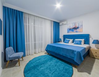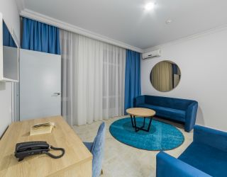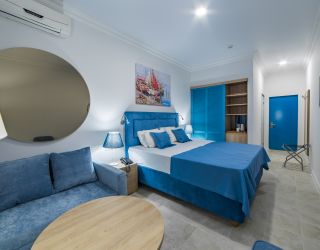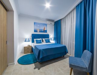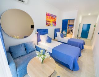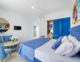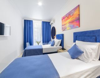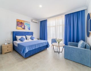 Трехэтажное здание отеля выполнено в средиземноморском стиле. На верхнем этаже – открытая зона отдыха. Отель располагает жилым фондом, рассчитанным на размещение около 120 человек. Номера отеля, несмотря на разницу категорий, обеспечены с одинаковым первоклассным качеством. В санузлах каждого из них, есть при душевой гигиенические наборы косметики, фены, халаты и тапочки. Каждый номер обеспечен высококачественным набором бытовой техники: системой кондиционирования воздуха, сейфом, холодильником и телефоном, телевизором и Wi-Fi. Оригинальное декорирование номеров в сине-белой цветовой гамме создает впечатление особой чистоты, свежести и прохлады.
