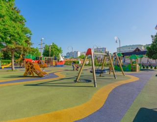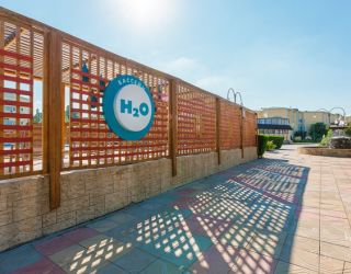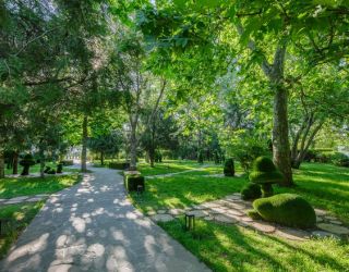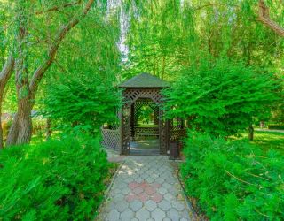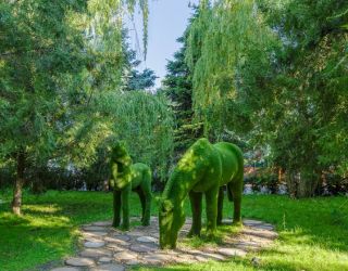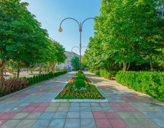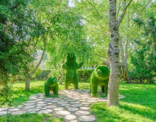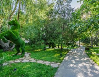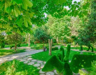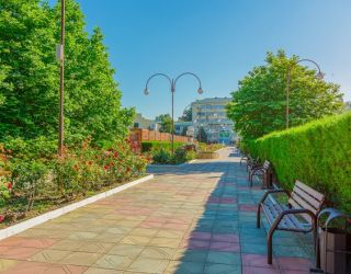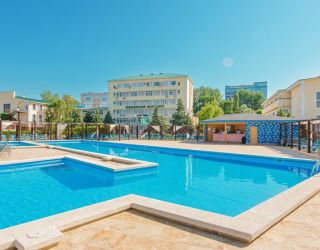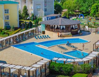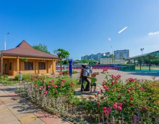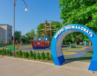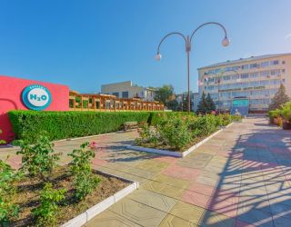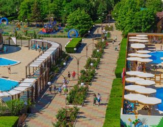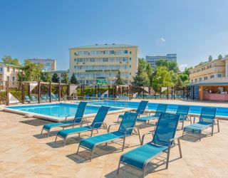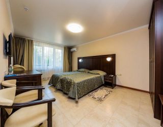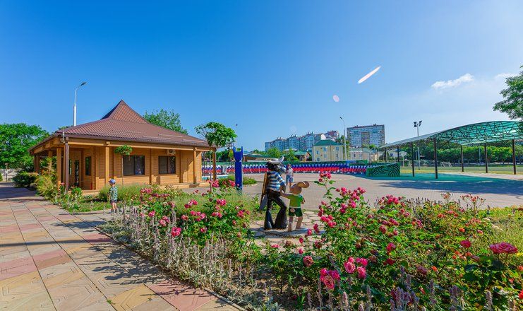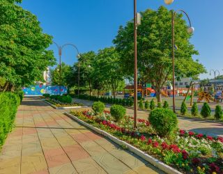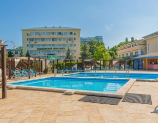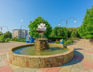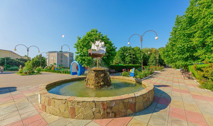 Санаторий занимает обширную, утопающую в зелени, благоустроенную территорию площадью 8 гектаров. Тенистые аллеи для прогулок, фонтаны, беседки, яркая подсветка в темное время суток — все это располагает к комфортному отдыху. На территории также есть парк фигурных растений — Топиари.