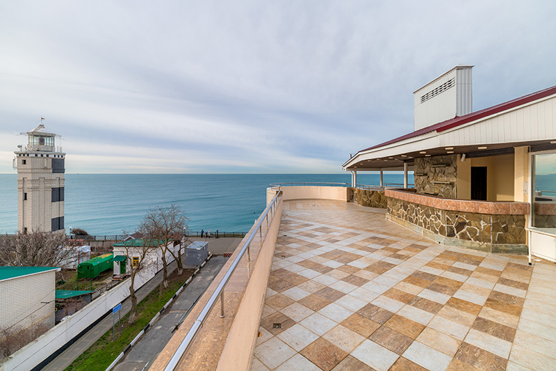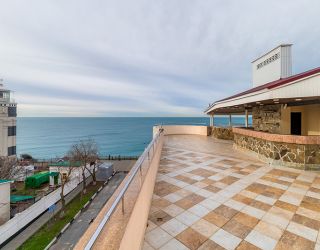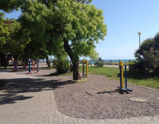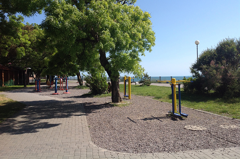 До ближайшего спуска к городскому галечному пляжу – около 400 метров. Он оборудован навесами, солнцезащитными зонтами, лежаками и шезлонгами.