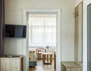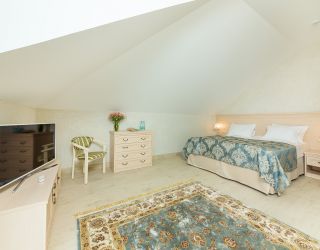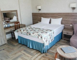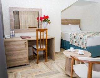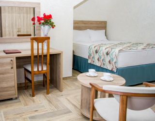 На благоустроенной территории площадью почти в гектар разместились 7 трехэтажных коттеджей, в общей сложности включающие 70 комфортабельных номеров категории Стандарт, Делюкс и Люкс. В номерах светлый современный интерьер, везде есть индивидуальный санузел с душем, кондиционер, плазменный телевизор.