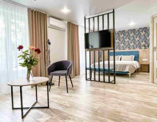 Номерной фонд располагается в 3-этажном гостиничном корпусе. В комнатах выполнен современный ремонт, установлена удобная мягкая мебель, а также шкафы и тумбочки. К услугам отдыхающих: телевизор со спутниковыми каналами, Wi-Fi, сплит-система, мини-холодильник. Санузел оснащен душем. Предоставляются туалетные принадлежности, полотенца, мягкие халаты и тапочки.