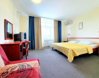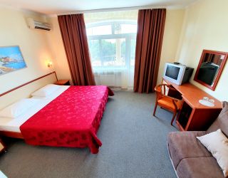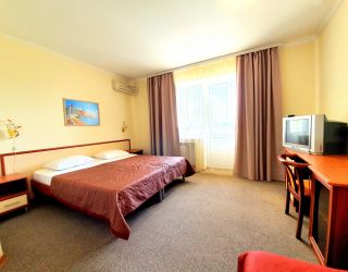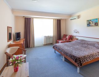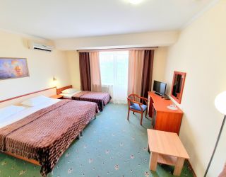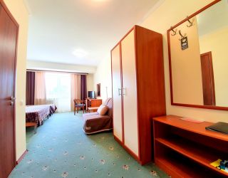 Пятиэтажный корпус пансионата разместился на закрытой территории площадью в 1 гектар. Жилой фонд, рассчитанный на 240 отдыхающих, предлагает двух- и трехместные комфортабельные номера. В каждом предусмотрен санузел с душем, есть сплит-система, телевизор-ЖК, электрочайник и набор чайной посуды.