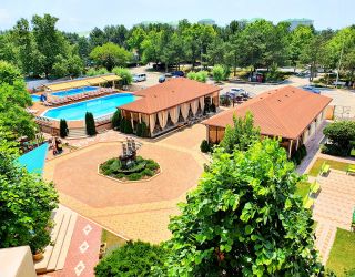 В 400 метров от жилого корпуса пансионата разместился собственный песчаный пляж.