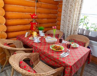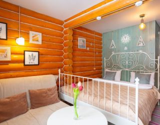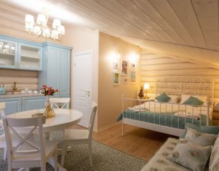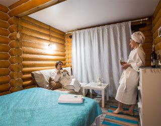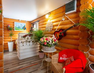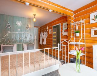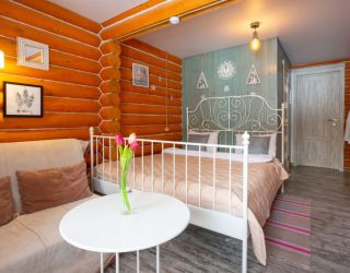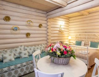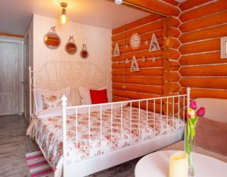 Номера отеля располагаются в шале из натурального сруба сибирской сосны. В строительстве и ремонте использовано минимальное количество лакокрасочных изделий. Все номера имеют небольшую площадь. Внутренняя отделка также выполнена из дерева. Мебель современная, комфортная, выполнена в белом цвете. Сочетание светлых тонов и дерева позволяет максимально расслабиться и снять напряжение. В комнатах нет телевизоров, работает высокоскоростной интернет. Санузел с душевой, косметическими принадлежностями, полотенцами, халатами и тапочками. Некоторые номера имеют собственную обустроенную кухню для самостоятельного приготовления еды и открытую террасу для отдыха. На территории эко-отеля есть общая кухня, где можно приготовить любимые блюда.