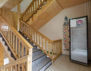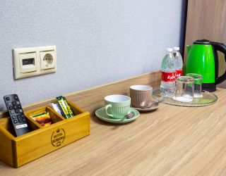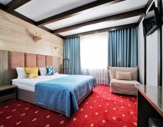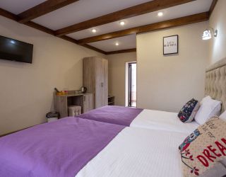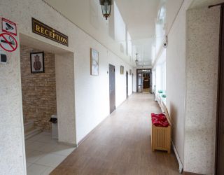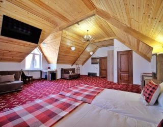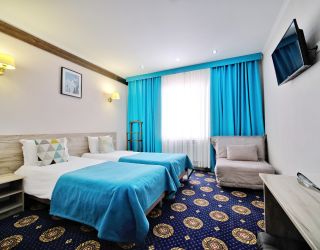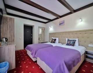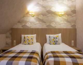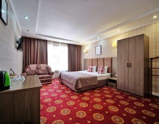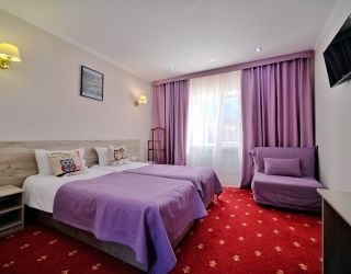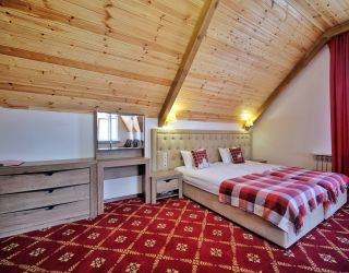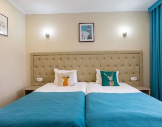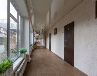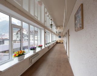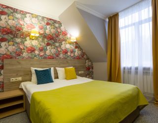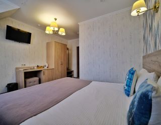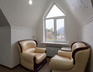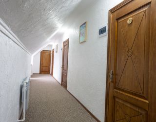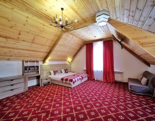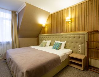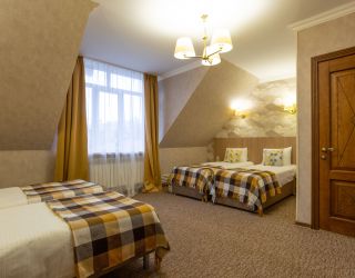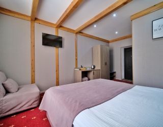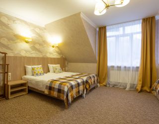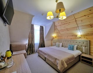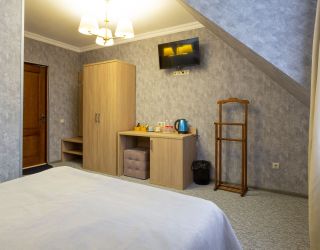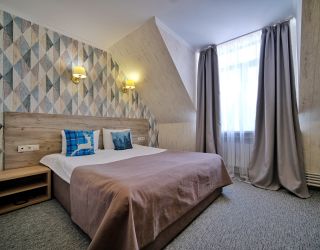 Двухэтажный корпус отеля с мансардным этажом разместился недалеко от центральной улицы поселка — улицы Ленина. Гостей ожидают двухместные номера Стандарт Twin и Double, Семейные номера и Делюкс. Каждый из них оснащен собственным санузлом с душем, есть телевизор, холодильник. Во всех комнатах стильный лаконичный интерьер.