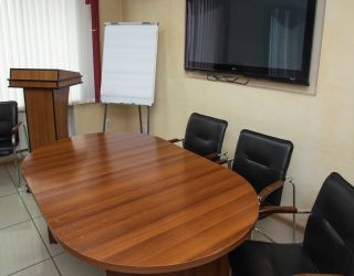 Плазменный телевизором с диагональю экрана 60 дюймов,2 радио-микрофона, компьютер, факс, принтер, копировальный аппарат, DVD-плеер, звуковое оборудование, доска"флипчарт", бумага, маркеры, трибуна