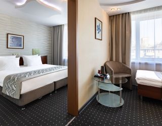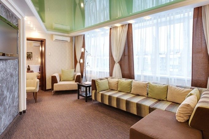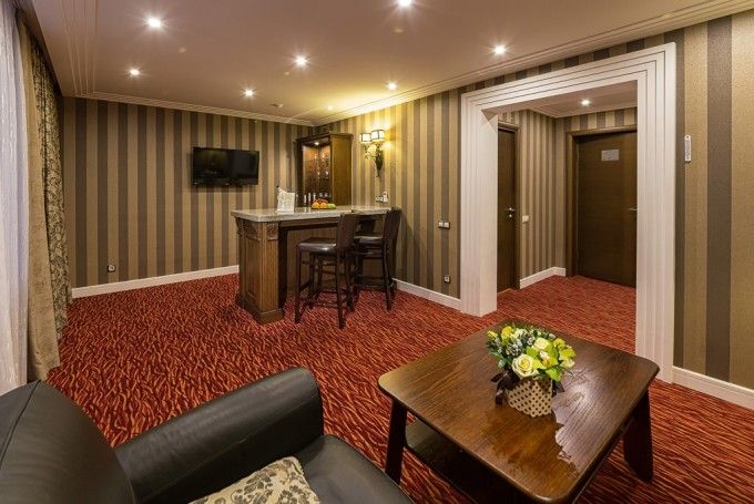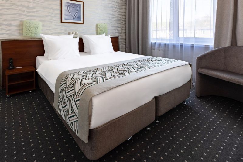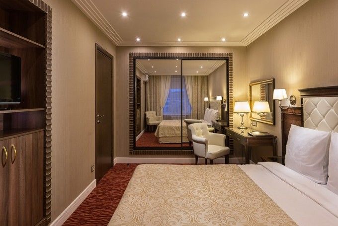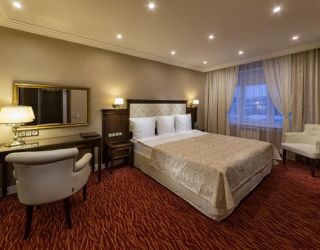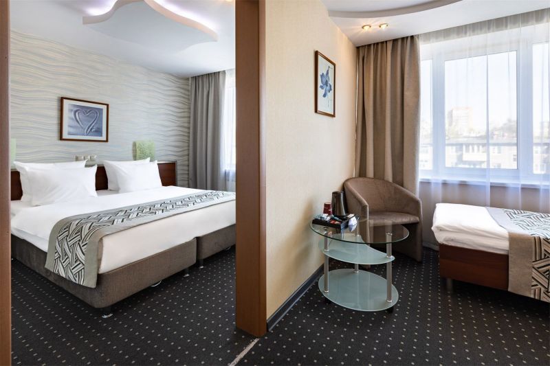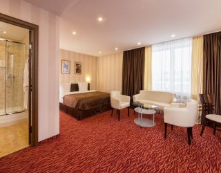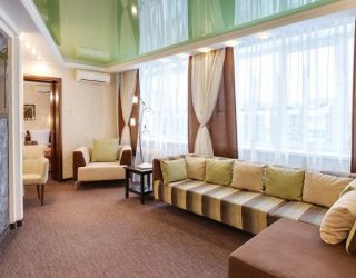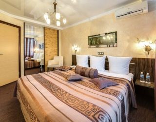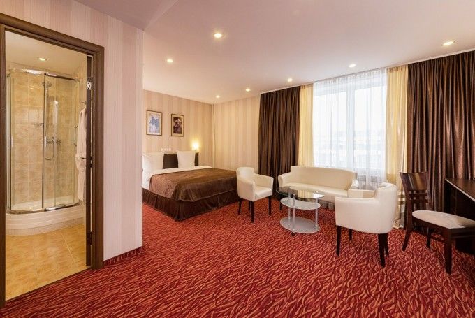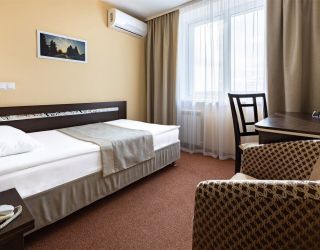 8-ми этажное здание отеля, оснащенное лифтом, возвышается в благоустроенном тихом квартале, ограниченным тенистыми аллеями улиц Гагарина и 50-лет Октября. Жилой фонд состоит из 217 номеров категории Люкс, Полулюкс и Стандарт, Эконом, оформленных в современном неоклассическом стиле с использованием теплой цветовой гаммы. В каждом номере есть санузел с душем или ванной, бытовая техника – ЖК-телевизор, кондиционер, холодильник, набор посуды и косметических принадлежностей для гостей, Люксы оснащены джакузи.