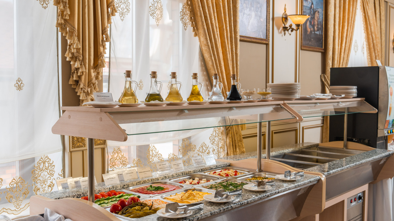 Блюда здорового питания выделены на «шведском столе» информационными табличками зеленого цвета.
