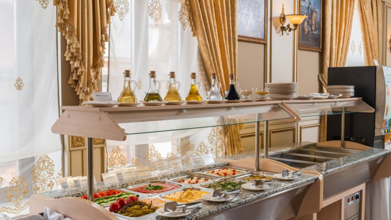 В ресторане предлагается питание по системе «шведский стол» на протяжении всего дня с 08:00 до 20:00. Завтрак плавно переходящий в обед, обед плавно переходящий в ужин, с постепенной сменой ассортимента предлагаемых блюд. Гостей отеля приятно удивит разнообразие блюд: салаты и холодные закуски, соленья, супы, горячие блюда и гарниры, выпечка и десерты, фрукты, прохладительные безалкогольные напитки: компот, каркаде, лимонад, а также ассортимент алкогольных напитков. С 20:00 возможен заказ блюд и закусок по меню за дополнительную плату. По пятницам и в предпраздничные дни работа ресторана по системе «шведский стол» продлена до 21:00.