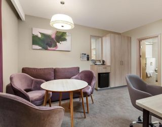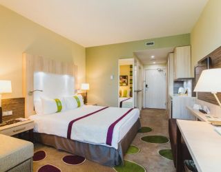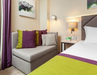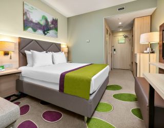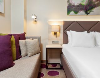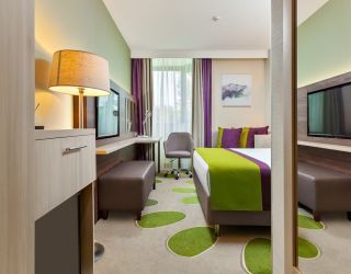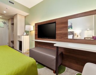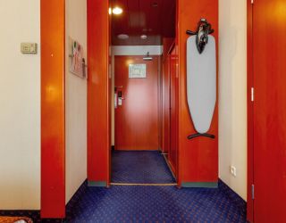 В реновированных номерах — яркий стильный интерьер, звуконепроницаемые окна, есть санузел с ванной, кондиционер и ЖК-телевизор.