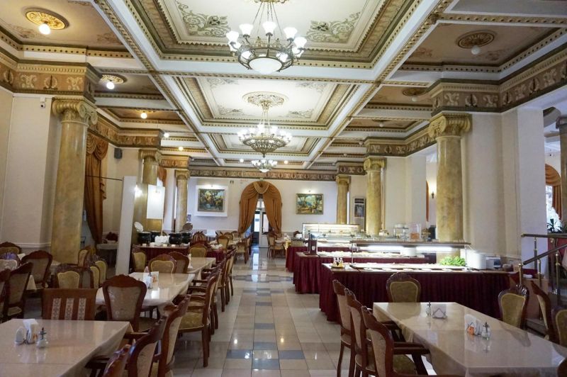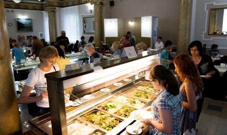 Питание в санатории «Шахтер» в Ессентуках трехразовое, по принципу шведского стола. Предлагаются блюда европейской, русской и кавказской кухонь; возможно вегетарианское и диетическое питание.