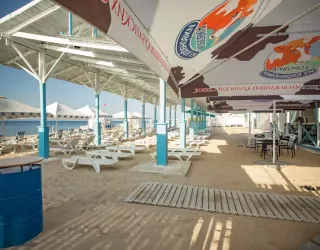 Песчаный, оборудованный шезлонгами, навесами от солнца, кабинками для переодевания и душевыми