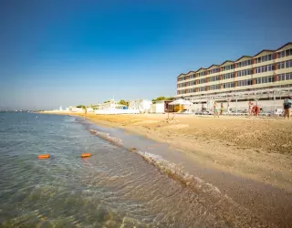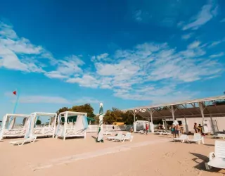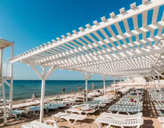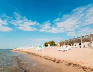 Пляж песчаный охраняемый, оборудован всем необходимым для отдыха: лежаками, навесами, туалетом, кабинками для переодевания, душевыми, находится в 300 м от комплекса.