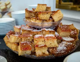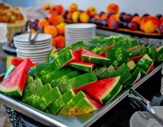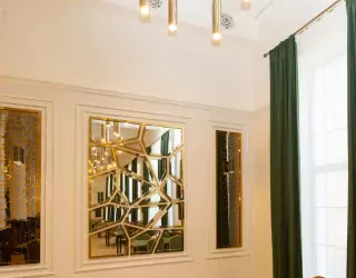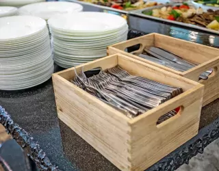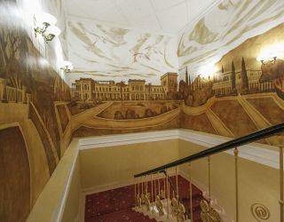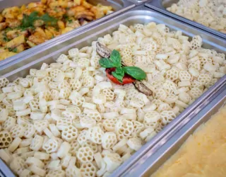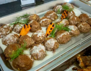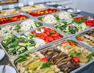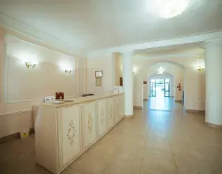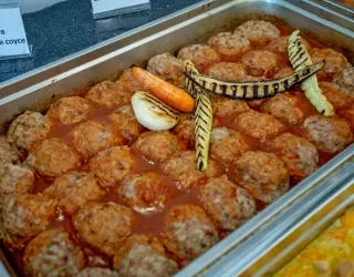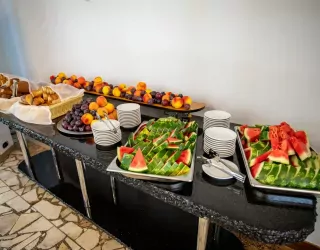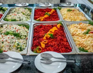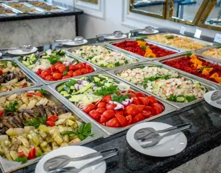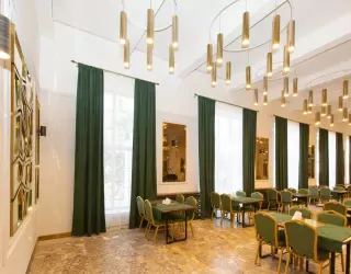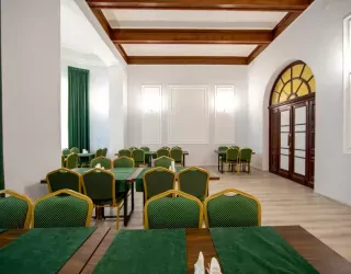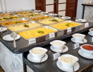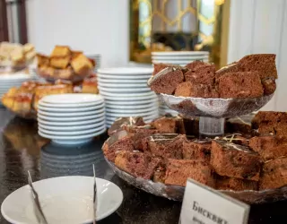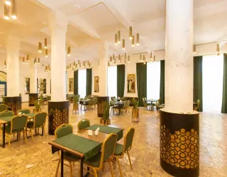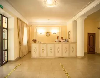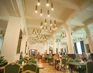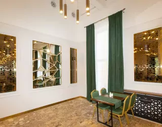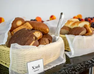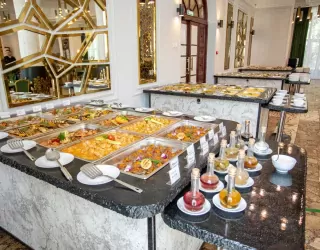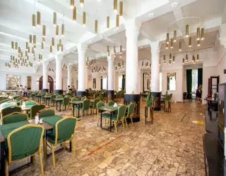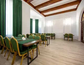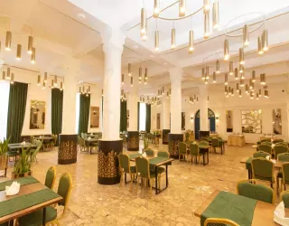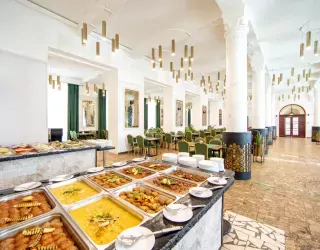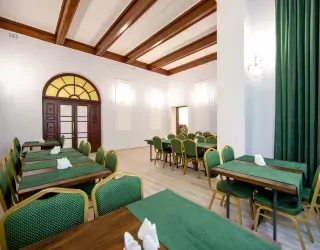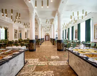 Ресторан находится в великолепном колонном зале с 6-метровыми сводами. Питание организовано по системе шведский стол.