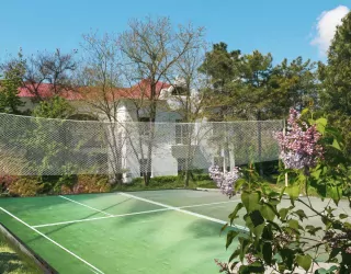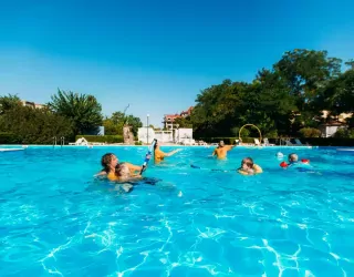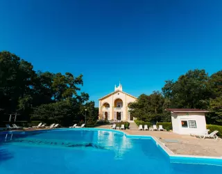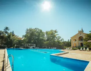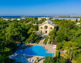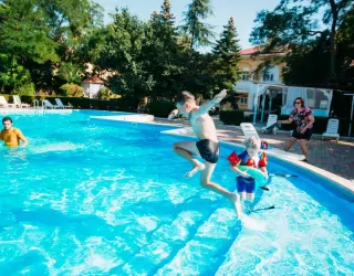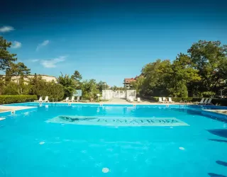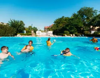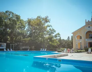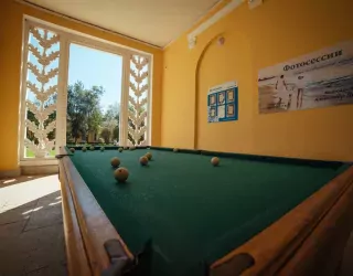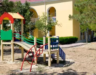 Есть открытый пресноводный бассейн с выделенной для детей зоной, детские площадка и комната.