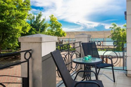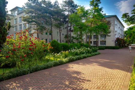 Поездом до ж/д вокзала г. Евпатория, далее на трамвае №3 до остановки «Гостиница Украина», далее пройти пешком 1,4 км до санатория.