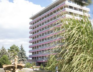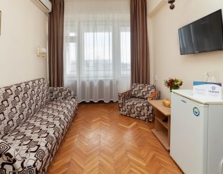 - Четырехэтажный корпус № 1 без лифта в нём расположена столовая, категории номеров: улучшенные комфорты (2-комнатные) и улучшенные стандарты (1-комнатные) с балконом и без балкона, имеет крытый переход в лечебный корпус.