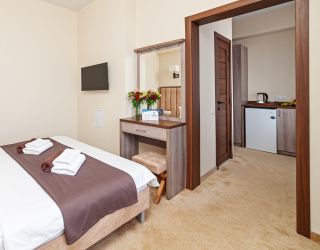 - Корпус №4 – девятиэтажный, оборудован лифтами, предлагает номера комфорт семейный (2-комнатные), стандарт (1-комнатные), стандарт-премиум двухместный с видом на море (однокомнатный), имеет крытый переход в лечебный корпус и столовую.