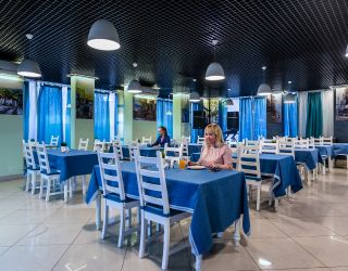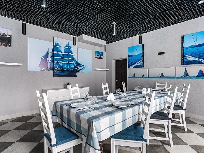 Зал оформлен в морском стиле. Идеальная локация для деловых переговоров, празднования частных и деловых событий мини группой. Зал оборудован кондиционером, ЖК телевизором.