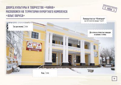 Киноконцертный зал "Изумрудный" расположен на территории курортного комплекса "Алые Паруса" во Дворце Культуры и Творчества "Чайка". Это комплекс площадок для деловых, имиджевых и корпоративных мероприятий, выставок, бизнес-тренингов, презентаций, праздничных вечеров и концертов.