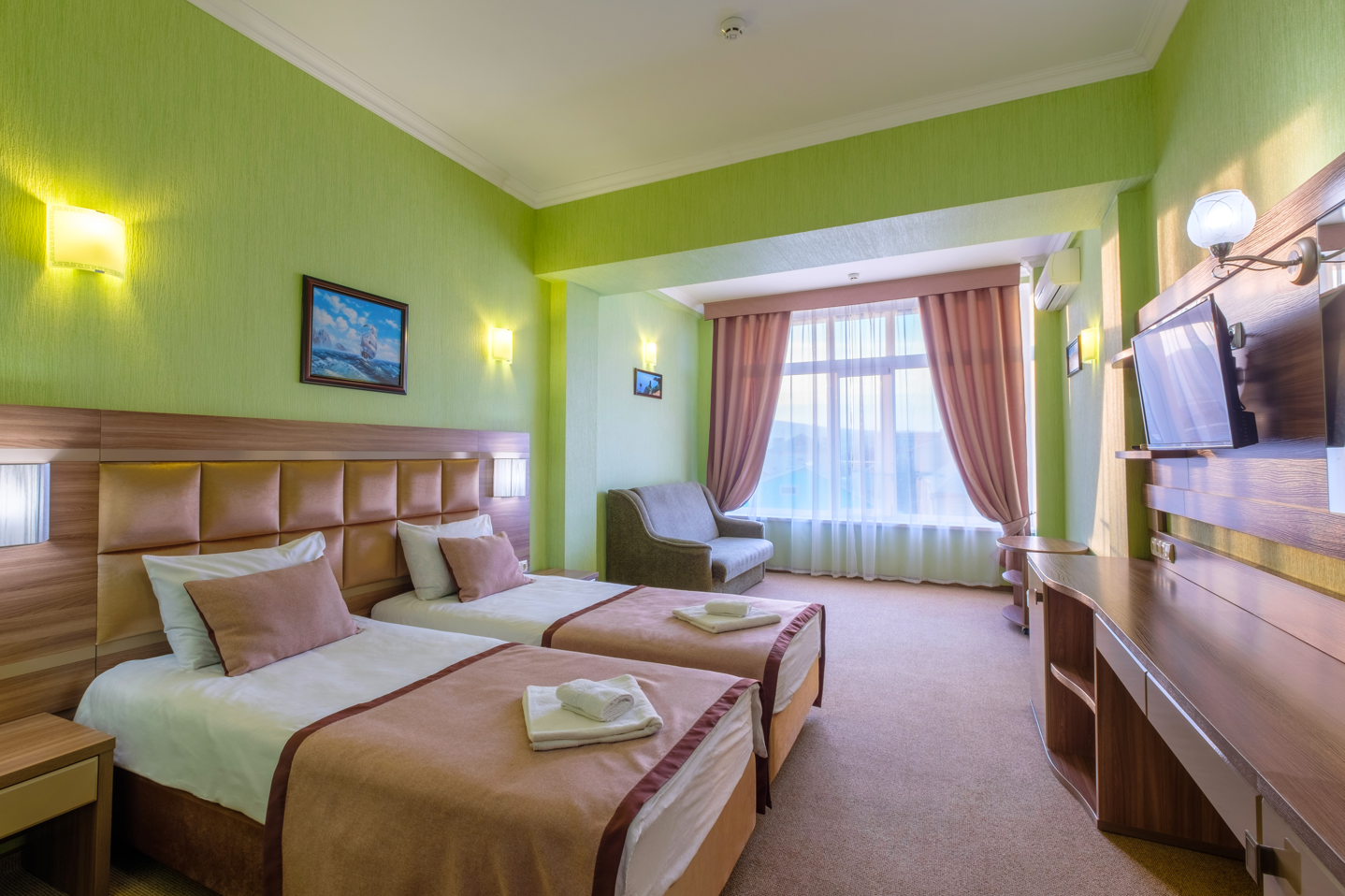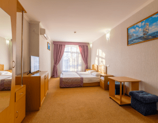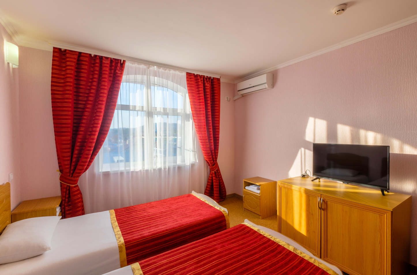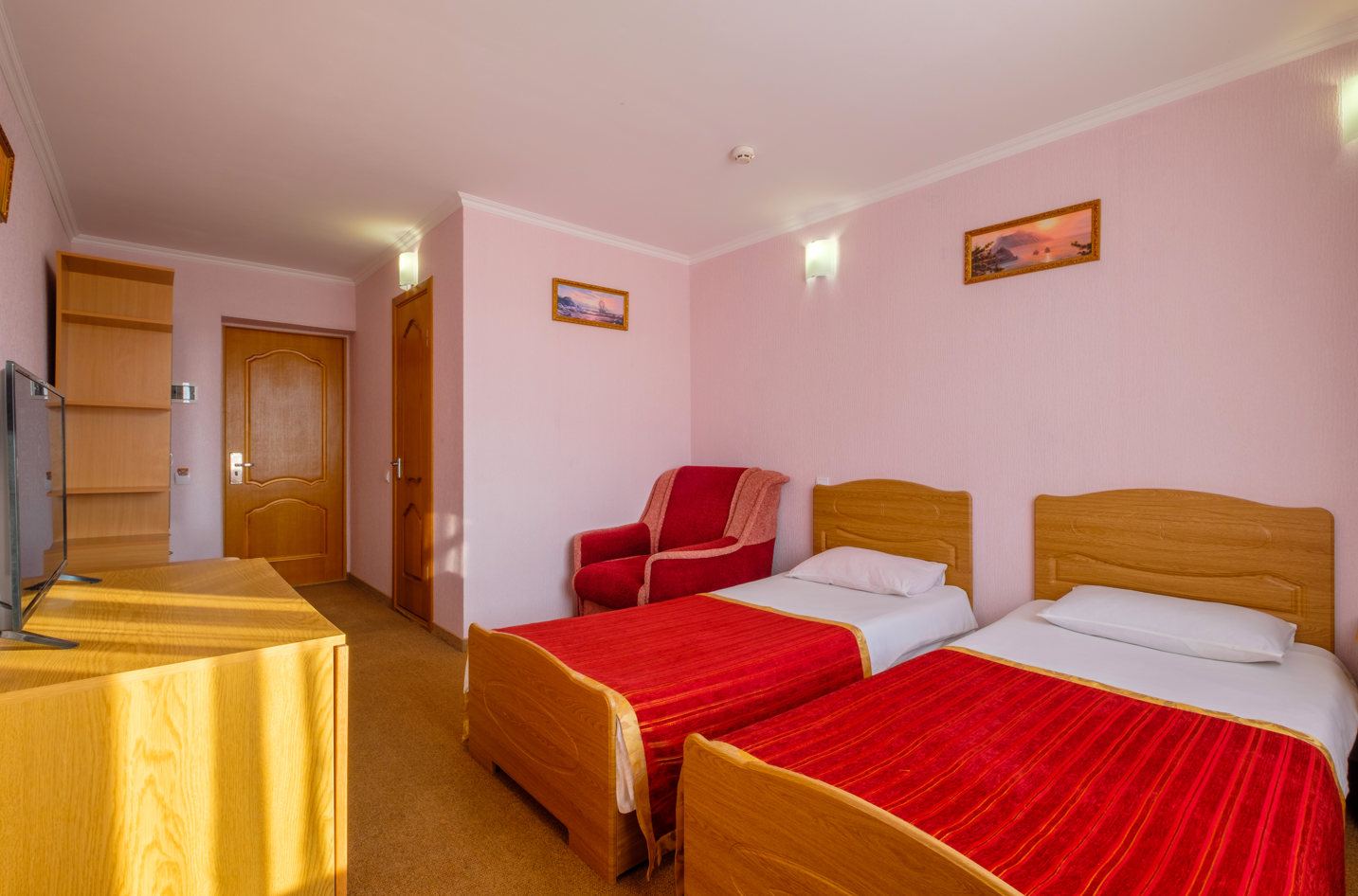 4-этажное здание без лифта, включает в себя 77 номеров. Все номера, независимо от категории, укомплектованы необходимой мебелью, оборудованы санузлом с душем, мини-сейфом, кондиционером, ТВ, холодильником, чайником, есть доступ к wi-fi.
