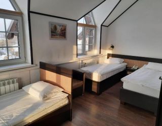 Трехэтажный корпус отеля, стилизованный под фахверковую архитектуру, включает в себя двух- и трехместные номера разной категории комфорта. В каждом номере имеется индивидуальный санузел с ванной или душем, кондиционер, телевизор.