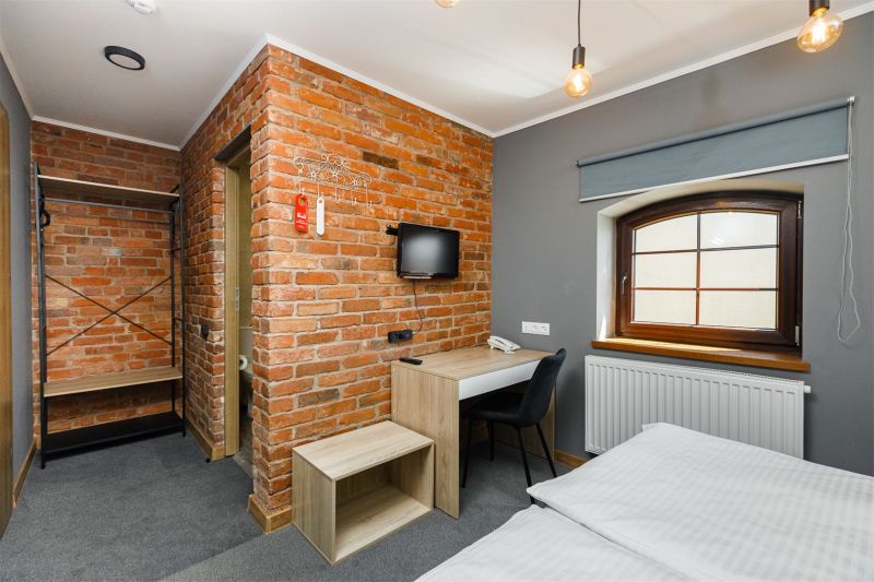 Отель расположен на 4-ом этаже исторического немецкого здания, на 2м этаже находится кинотеатр, на 3м этаже располагается уютный фитнес зал, на 1м этаже работает кафе.