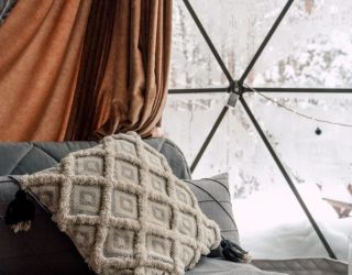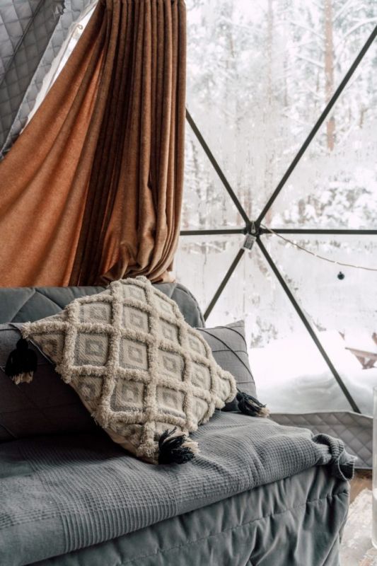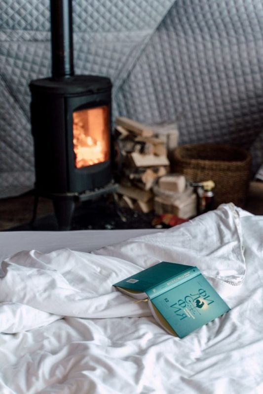 Всего на территории 10 жилых модулей. В каждом модуле двуспальная широкая кровать с белоснежным бельем, биотуалет, умывальник как у бабушки в деревне, розетки, продуманная вентиляция, чугунная печь и, конечно, большое панорамное окно с видом на настоящую природу.