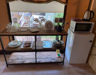 Для более сложной готовки на территории глэмпинга работает общая кухня, также возле каждого тента оборудована мангальная зона для приготовления блюд на огне.