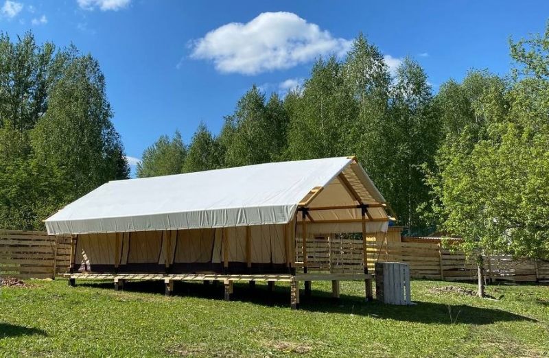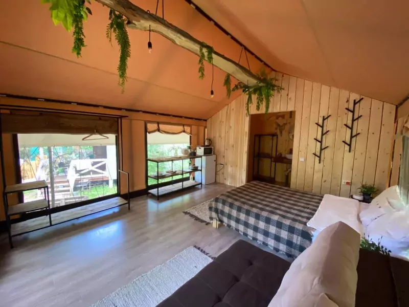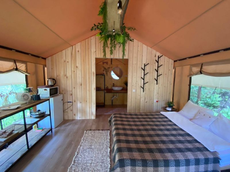 Для размещения предлагается 9 сафари-тентов, полностью благоустроенных и теплых. Они не продуваются и в них тепло даже ночами. В каждом домике предусмотрены спальные места – двуспальная кровать и диван, мини-кухня с посудой и холодильником, санузел с душем, терраса для отдыха и ванна с горячей водой возле каждого шатра.