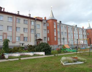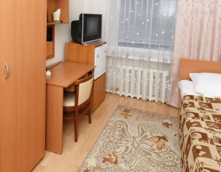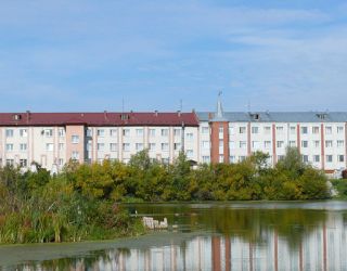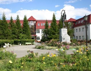 Территория санатория компактная, но ухоженная. Деревья и кустарники, цветы и малые архитектурные формы создают особое настроение. С одной стороны, санаторий окаймляет улица Революции – одна из крупных городских улиц, с другой – берег озера с обустроенной набережной. Купание не разрешено ввиду неизученности донного рельефа и отсутствия проб воды. Санаторный комплекс состоит из трех 3-этажных корпусов, соединенных теплым переходом со столовой, грязелечебницей, танцевальным и бильярдным залом. Уровень комфортности номеров различен – от блочных до люксов. Они оформлены в спокойном традиционном стиле, оснащены необходимой мебелью и техникой согласно категории.