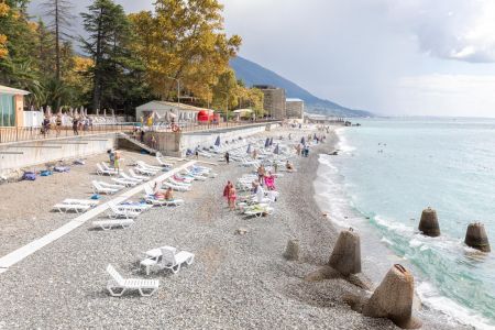 Поездом или самолетом – до г. Сочи (Адлер), далее на общественном транспорте или на такси до «Казачьего рынка» (8 км от ж/д вокзала, 15 км от аэропорта), затем пройти пешком около 500 м до пограничного поста на р. Псоу до границы России и Абхазии. После самостоятельного прохождения паспортного и таможенного контроля до места отдыха можно доехать на автобусе, маршрутном такси или воспользоваться услугами частных водителей.