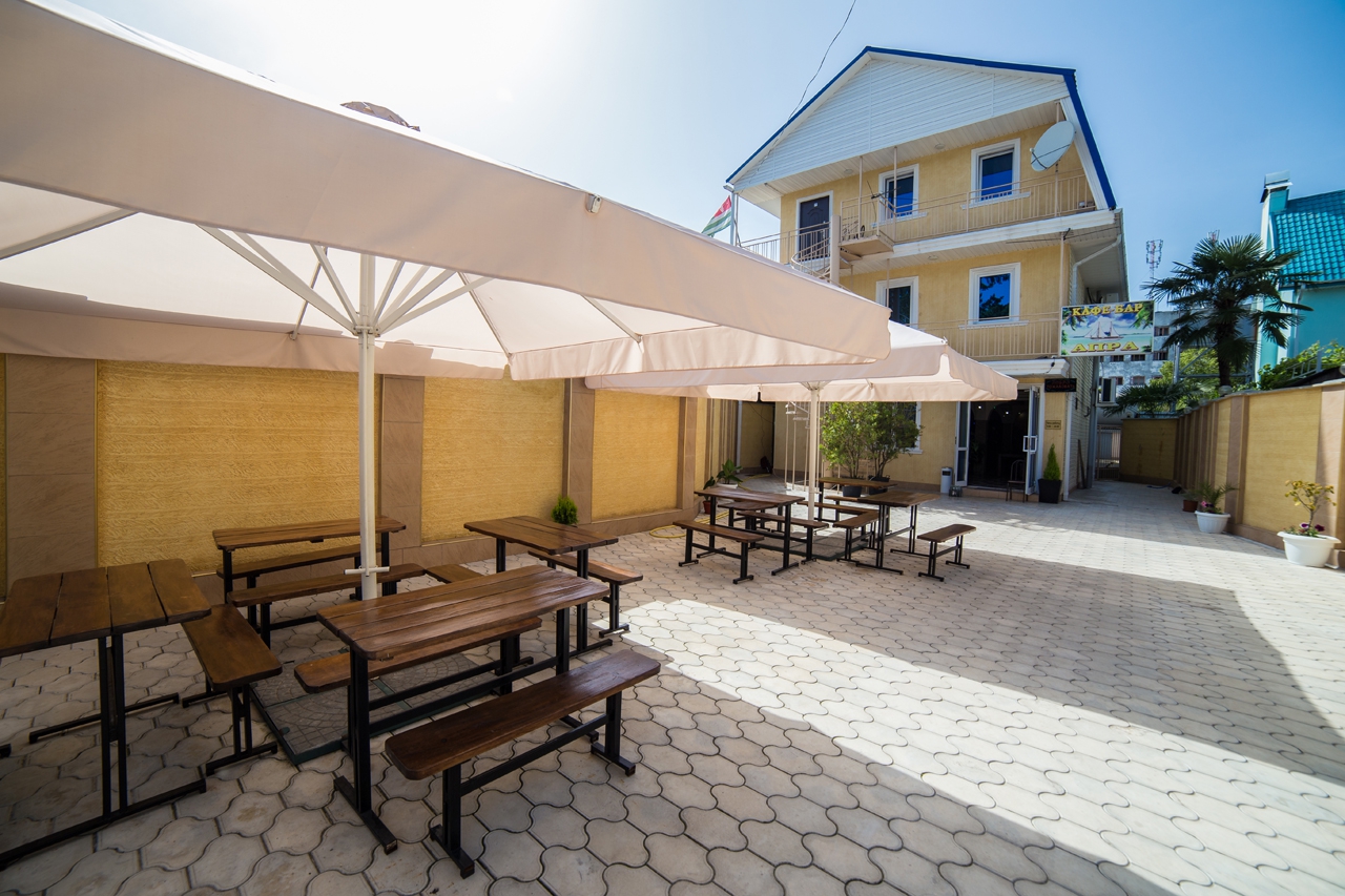 При гостевом доме работает кафе с абхазской кухней. На территории доступна сеть wi-fi, для автовладельцев предусмотрена охраняемая парковка. Всего в 200 метрах от отеля разместился необорудованный галечный пляж.